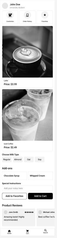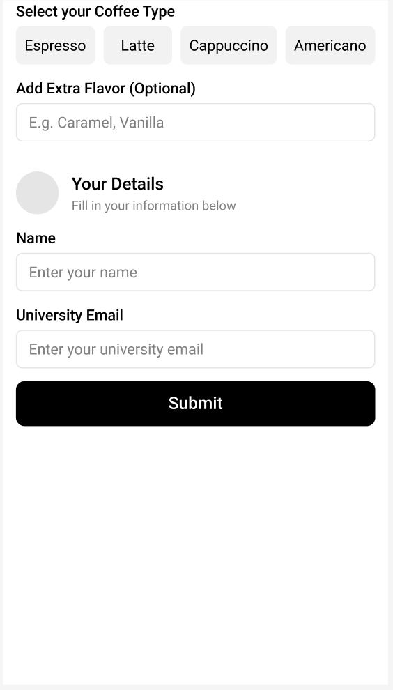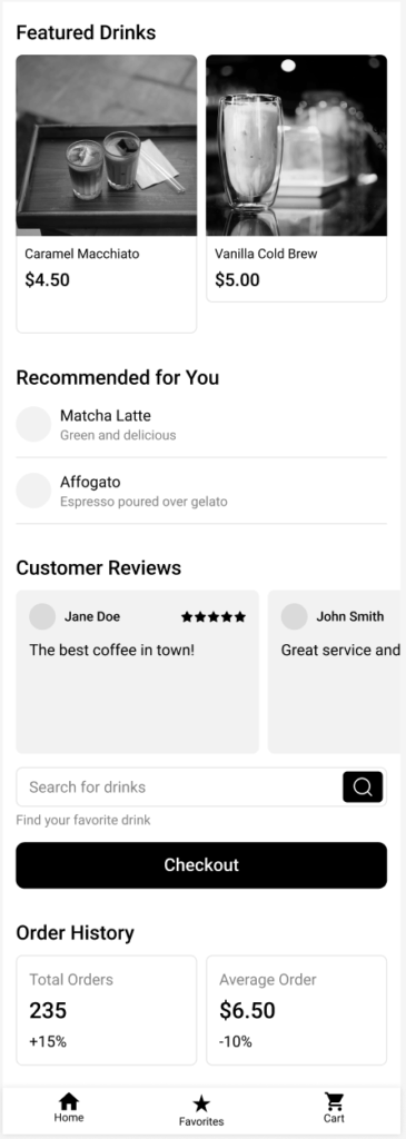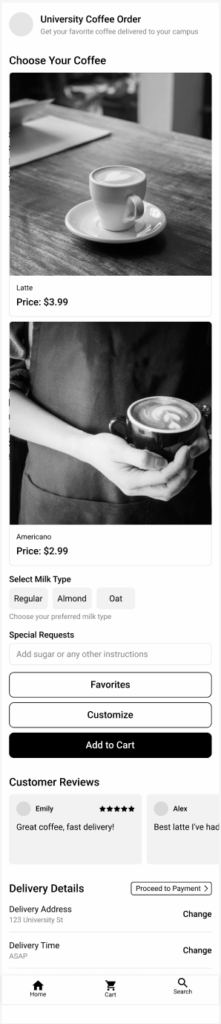 This portfolio showcases a series of high-fidelity wireframes for a modern coffee app, designed with the collaborative power of AI-driven tools and human creativity. The project explores user-centric design principles, from browsing and customizing drinks to seamless checkout and order tracking. Leveraging AI assistance enabled rapid ideation, intelligent layout suggestions, and efficient iteration, resulting in intuitive user flows and visually cohesive interface elements. Each screen is thoughtfully crafted to enhance usability, aesthetic balance, and brand identity for a next-generation digital coffee experience.