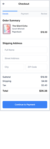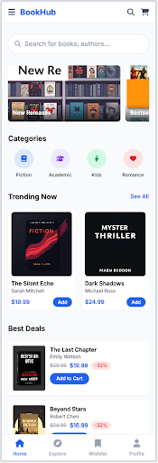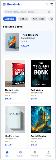 These are high-fidelity interfaces created using Figma. AI was used to add the images of books. The main interfaces, buttons, and menu were created in Figma. I wanted a modern and sleek theme and format so a sharp blue color was used throughout the designs. The goal of this design was to produce an online bookstore that is simple to navigate and easy on the eyes.